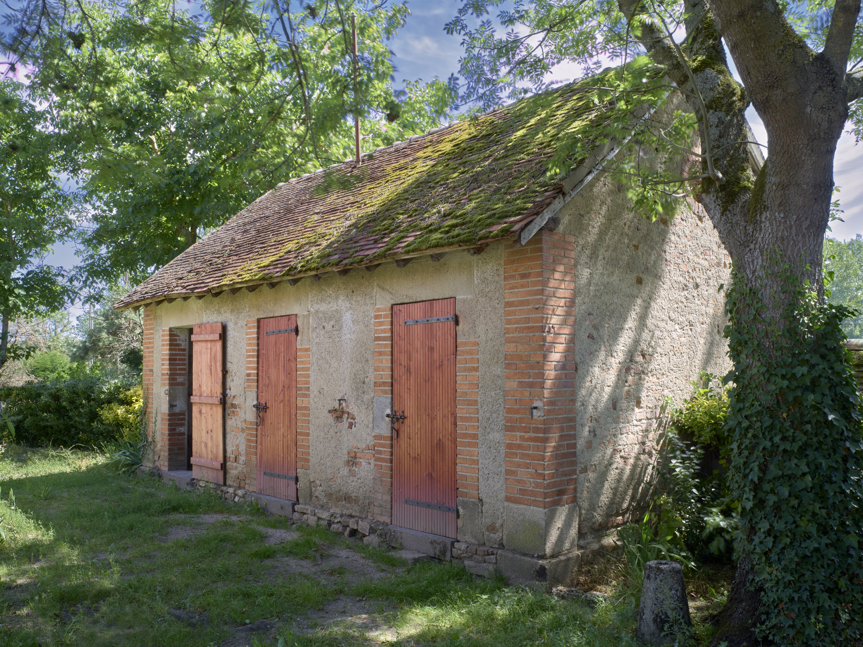 Poulailler, situé à l'est de la parcelle. Délimite en quelque sorte la partie jardin d'agrément qui bordait le route. Élévation ouest (côté fournil et logis). Au premier plan, à droite : borne et frêne (Photo chercheure.)Immatriculation