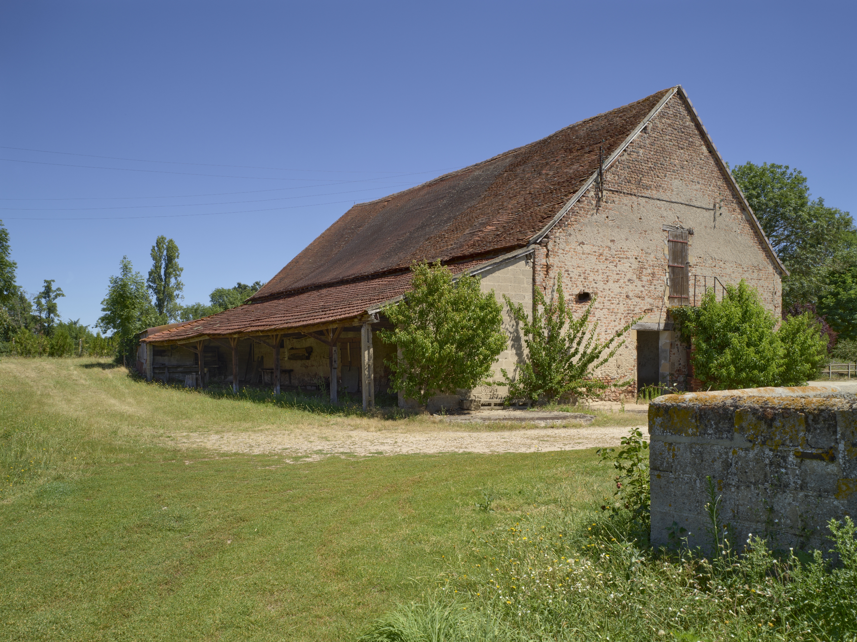 Grange-étable ouest. Pignon sud. Au rez-de-chaussée : entrée de l'étable à chevaux ; à l'étage : entrée de la chambre à grains, au sommet d'une montée d'escalier parallèle au pignon. À l'arrière (à gauche sur la photo) : appentis abritant du matériel et un établi.Immatriculation