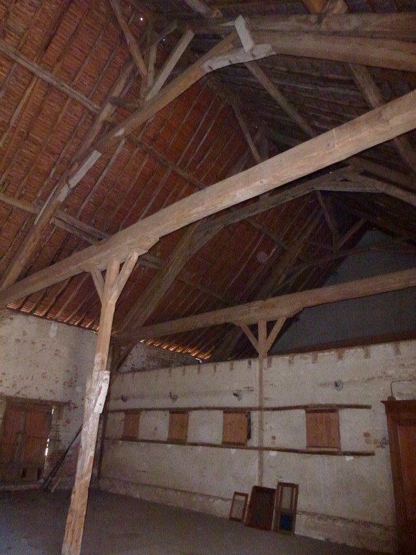 Grange-étable située à l'ouest de la ferme (au fond de la cour principale, en entrant). Intérieur : les baies fermées de volets coulissants servaient à fourrager les vaches. (Photo chercheure.)Immatriculation