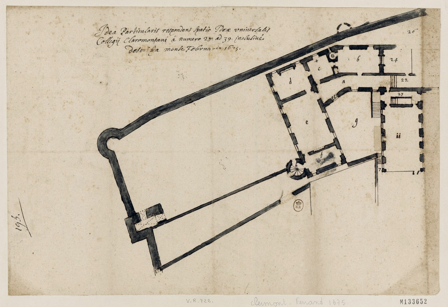 [Collège de Clermont-Ferrand, France : détails d'un autre plan d'ensemble] / [Chenuau Pierre] (architecte), 1675. 1 Dess. : plume, encre brune et noire, et lavis d'encre ; 26 x 39,5 cm (variante au verso) ; annoté en latin ; Vallery-Radot n° 722 (B.n.F., Est., FOL-HD-4 (9)).