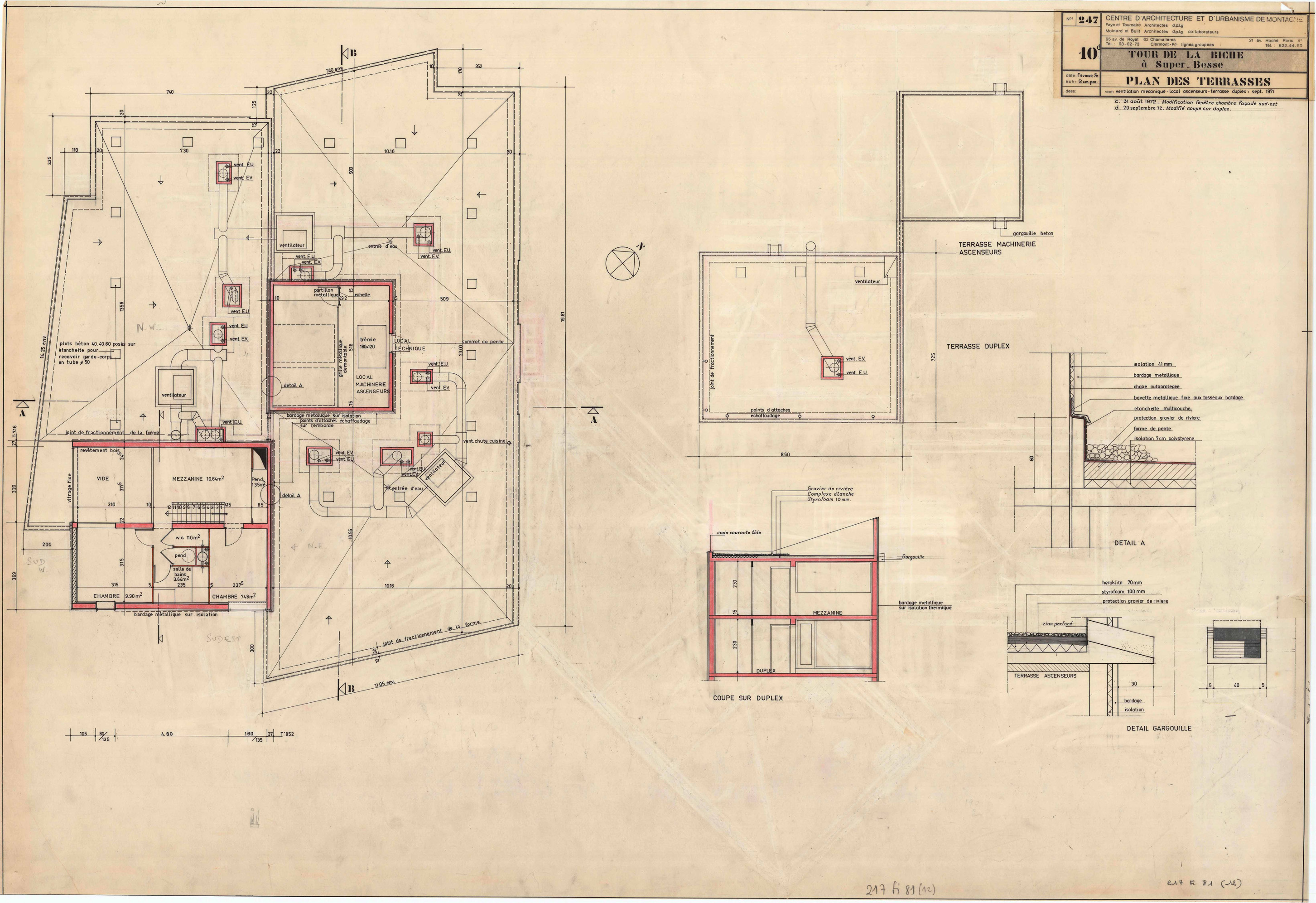 La Tour de la Biche, projet exécuté, plan des terrasses et du 22e étage (second niveau d'un appartement en duplex), février 1970, Faye et Tournaire architectes (AD63, 217 Fi 81 / 12).Immatriculation