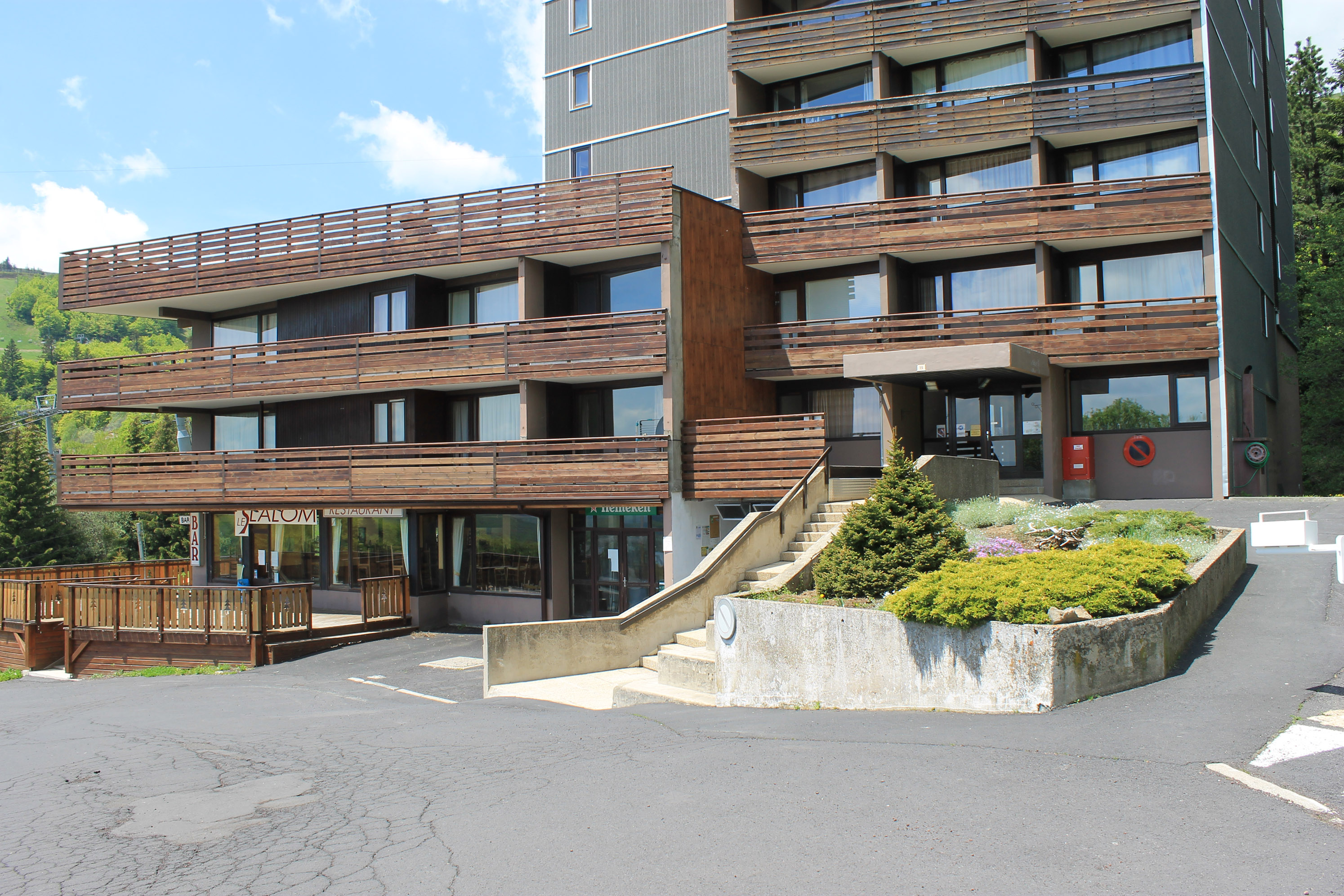 Super-Besse, la base de la Tour de la Biche vue du nord-est (entrées principales de la tour et de la brasserie).Immatriculation