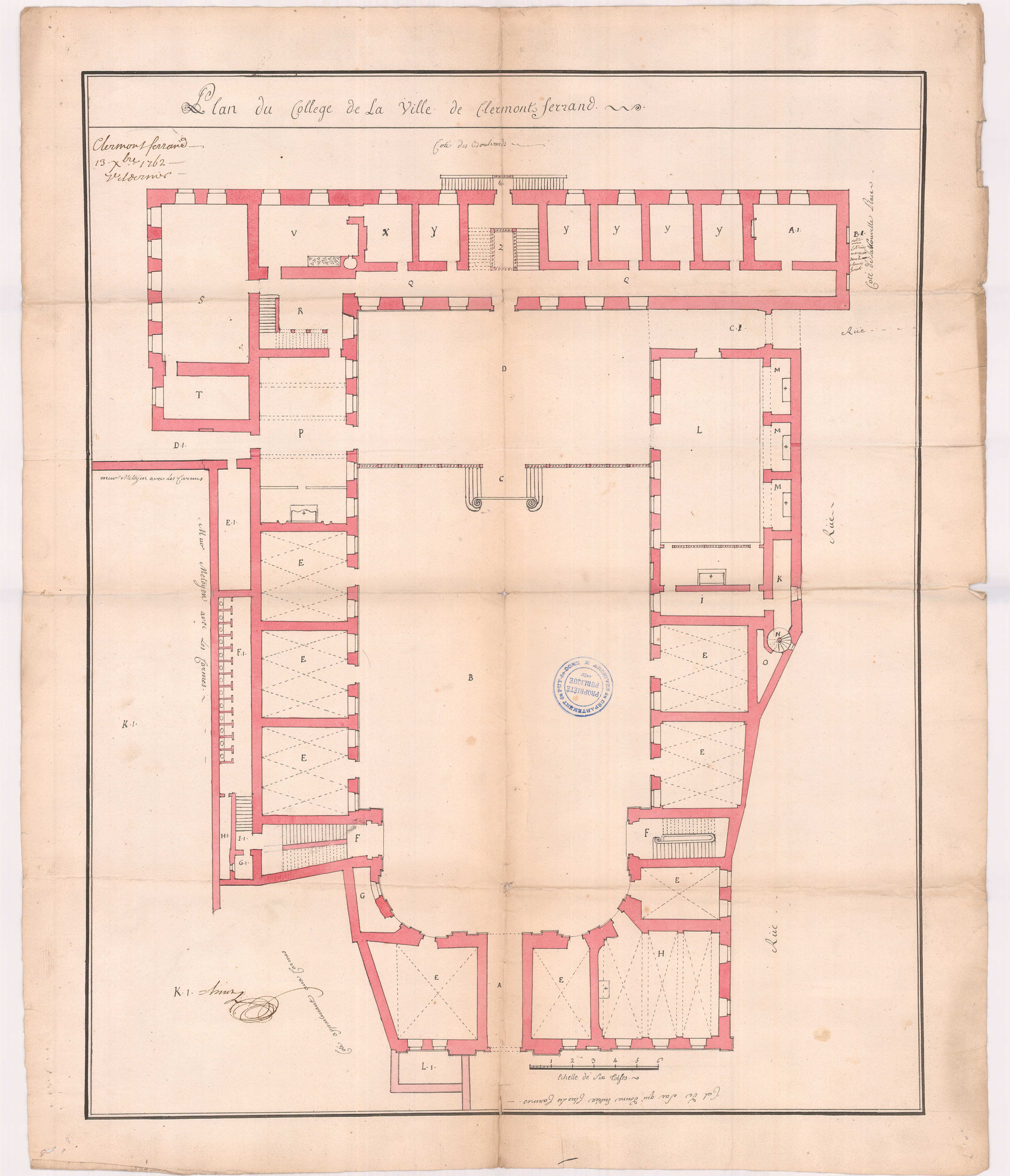 Plan du collège de la ville de Clermont-Ferrand / V..dernis (?), 13 décembre 1762. 1 dess. : encre brune, aquarelle ; 69x57 cm. Ech. 1,3 cm par toise (AD Puy-de-Dôme, 23 Fi 1)