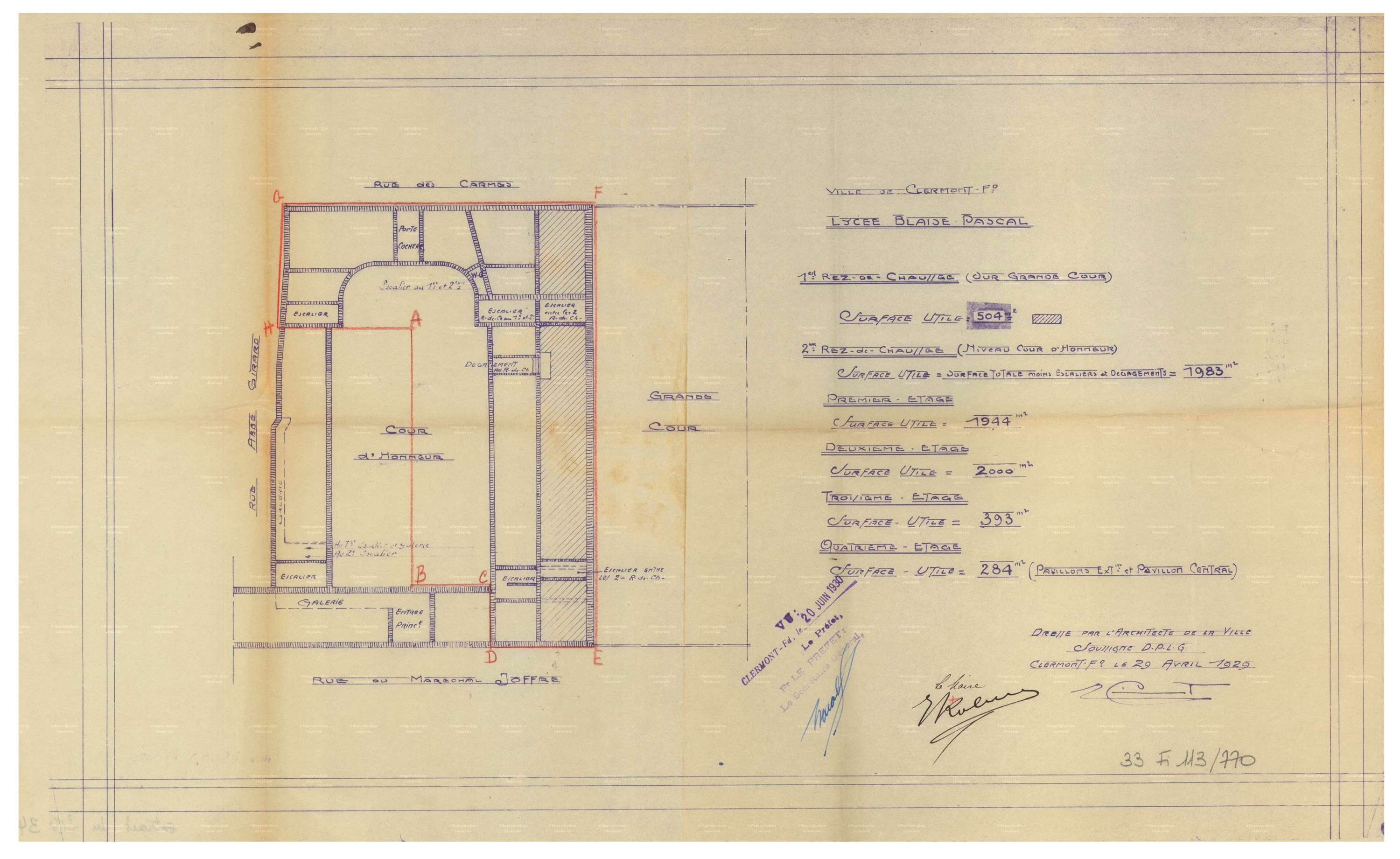 Plan du lycée en 1929, avec projet d'affectation d'une partie des locaux à l'Etat, par Pincot (architecte de la ville) (AD Puy-de-Dôme, 33 Fi 770)Immatriculation
