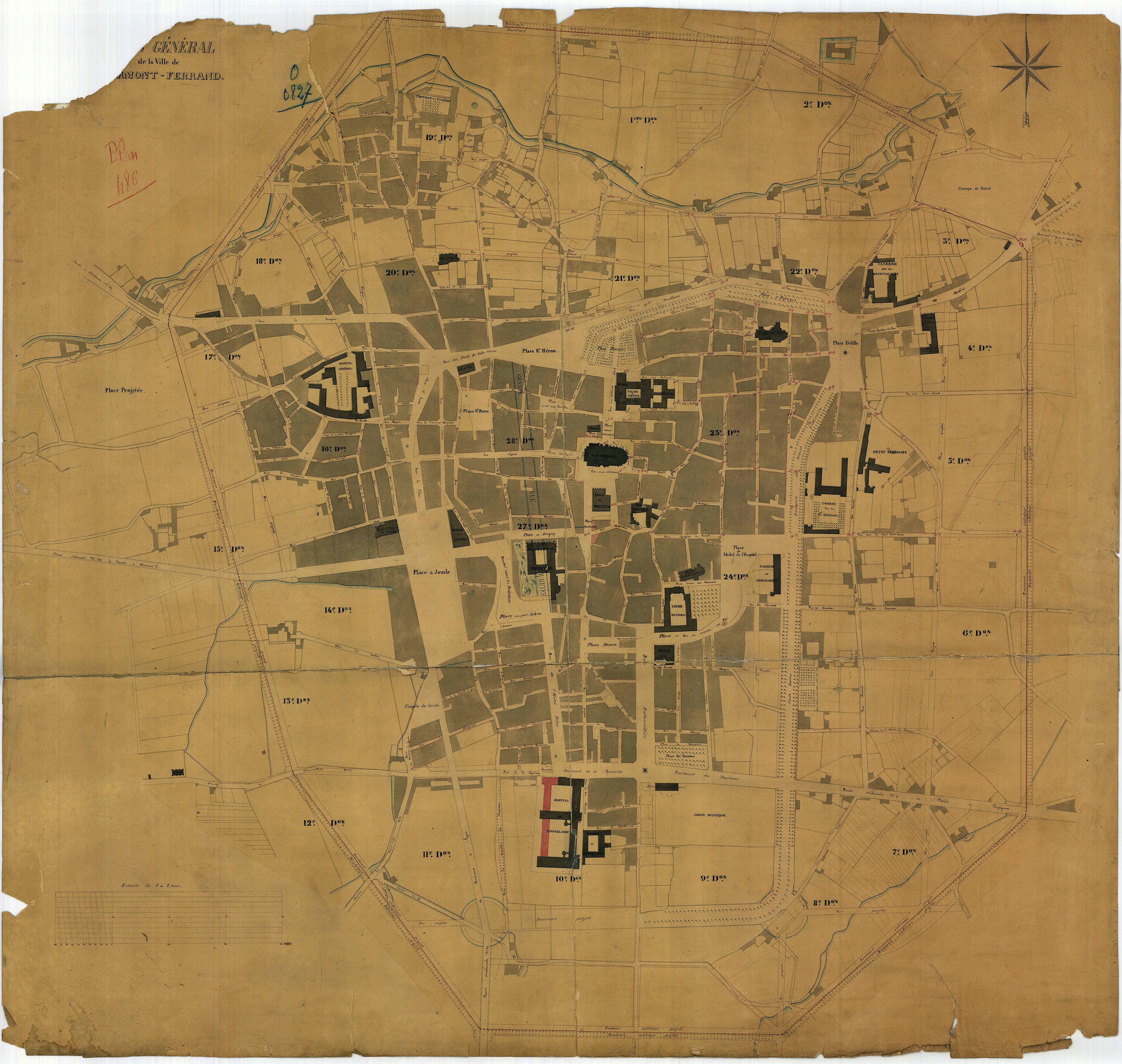 Plan général de la ville de Clermont-Ferrand / Champomier (géomètre), 1837-1848. 1 flle : papier, encre de chine, lavis gris. Ech. 1:2000 (AD Puy-de-Dôme : 1001 Fi 113/42)